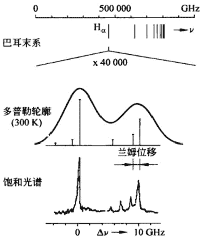 图 11 – 29 是饱和吸收光谱法的原理图。可调谐的激光光束经半透射镜片分为较强的激发光束和较弱的探测光束,以几乎相反的方向通过气体样品。用斩波器调制激发光束,当激发光束和原子作用时,由于光束非常强,使原子的吸收能力饱和,即把能够吸收光子的原子激发到激发态,从而不能更多地吸收其他光子,这时另一路光束(探测光束)通过气体样品到达接收器。这里有一个条件,就是两束光必须是和同一群原子发生相互作用时才会出现以上情况,而只有那些轴向速度分量为零的原子才能有贡献,因为这些原子对于相向而行的两束光均没有多普勒频移。由于激发光束是受到调制的,所以在调谐激光波长时,通过锁定放大器接收到相应的光谱。这样饱和吸收光谱就把那些对光束无多普勒频移的原子挑选出来,其光谱是无多普勒增宽的。运用这一方法肖洛等人测到了钠黄谱线之一的 D1 线的7个分量,其中最窄的线宽仅为(40 ± 4)MHz。而在这以前,它们被宽度达数百 MHz 的多普勒频宽所淹没,人们只能从理论上推测这些分量的存在而无法测出,即使用分辨率最高的摄谱仪、置于极低的温度下也无济于事。激光饱和吸收光谱术的灵敏度大大超过了以往任何光谱技术。例如,1975 年,肖洛和他的合作者用这种方法对浓度低到每立方厘米仅有 100 个原子的钠蒸气进行测量。在这一浓度下,平均每次只有 1 ~ 2 个原子处于探测光束之中,这是传统光谱技术根本无法察觉到的。肖洛等人借助可调谐染料激光器,使测量灵敏度提高了百万倍,可观测目标达到了单个原子的水平。图 11 – 30 是用饱和吸收光谱法测出的氢巴耳末谱系的一根谱线 Hα 的细节。可见,从饱和吸收光谱测到的精细结构是何等的细致!