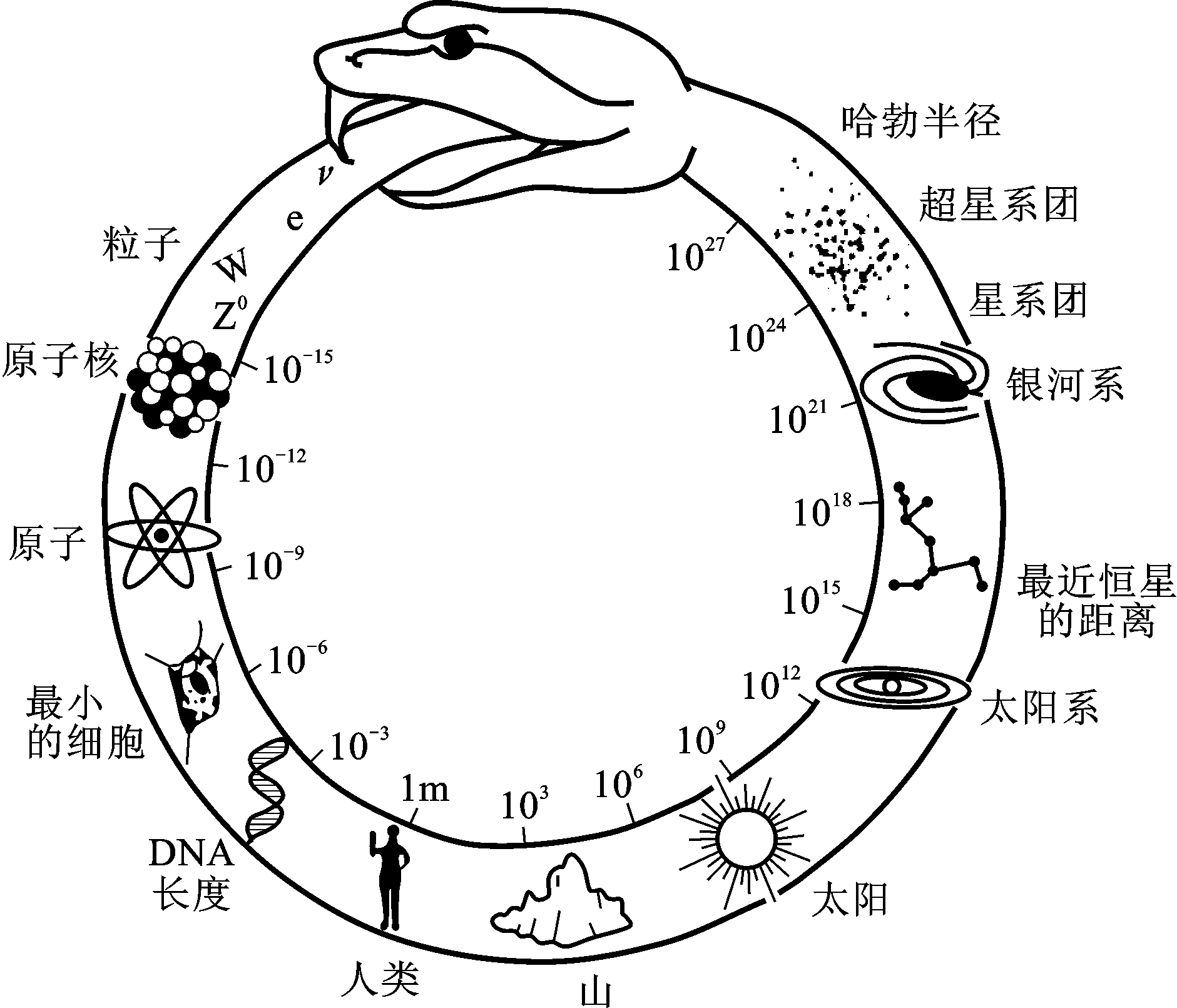 暗物质和暗能量的探讨正方兴未艾。解决这些新问题需要将描述微观世界的粒子物理学与描述宇观世界的宇宙学结合起来。极大和极小联系在一起,将是 21 世纪物理学和天文学研究的一个新特点。正如一张生动而含义深邃的示意图(图 12 – 30)描绘的那样,物理学的发展把极大和极小融合到了一起。这张图充分显示了物质世界的统一性,也很形象地表明了物理学发展的历程。