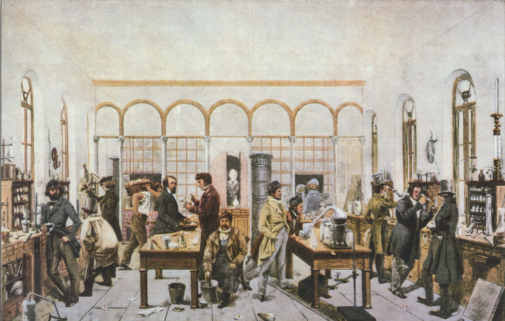 实验室作为一个进行实验的专门场所或建筑物,并不是最先从物理学开始的。化学实验室和天文学观测站比物理实验室早得多。Laboratorium 一词在德文中原来意味着化学实验室。中世纪有炼金术和占星术的实验室,当时为了求得长生不老的药物和找到金属嬗变的秘诀,炼丹师颇为活跃。例如在巴黎卢浮宫的画廊上就有一幅名画描绘 16 世纪的一间化学实验室,其实是“炼金”实验室,这是一间豪华的地下室,地面上摆满了蒸馏器、坩埚和甑。在 18 世纪乃至 19 世纪以前,这类实验室几乎毫无例外都属于个人所有,设在私人住宅的地下室,有的甚至就设在厨房的一角。瑞典著名化学家贝采利乌斯(Berzelius)的私人实验室就设在他家的厨房里,一个人单独工作,也乐于接受学生来学习,不过每年只限一个,他还常接纳化学家的访问,有的人甚至留下来一起作实验研究,成了他的帮手。