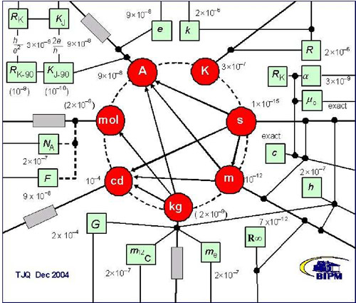 我们可以用图 15 – 10 来形象地表示基本物理常数的进步,还可以引用国际计量局发表的一张图(图 15 – 11)来表示 SI 单位制中的基本单位与基本常数及原子常数之间的联系。