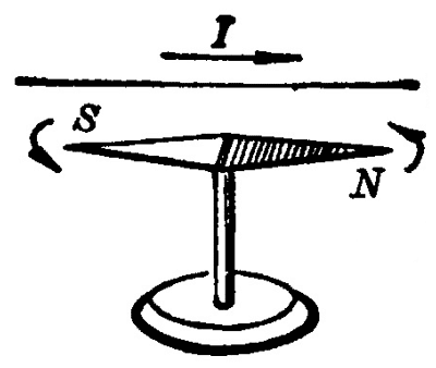 磁铁并不是磁场的唯一来源,1820 年丹麦物理学家奥斯特(1777—1851)做过下面的实验:把一条导线平行地放在磁针的上方,给导线通电,磁针就发生偏转(图 1–1),这说明不仅磁铁能产生磁场,电流也能产生磁场,电和磁是有密切联系的。