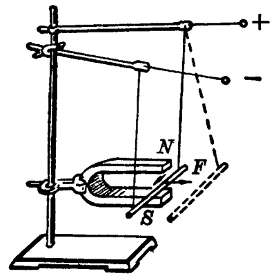 电流能产生磁场,反过来,磁场会不会对电流产生磁场力的作用呢?我们在初中做过的图 1–2 所示的实验回答了这个问题。把一段直导线放在磁铁的磁场里,当导线中通过电流时,可以看到导线因受力而发生运动,这个实验使我们进一步知道电和磁的联系,磁场不仅对磁极产生磁场力的作用,对电流也产生磁场力的作用,这是一个重要实验,后面我们常要提到它。