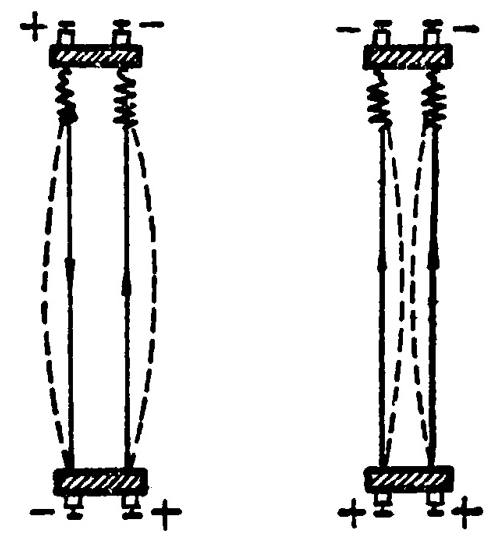 实验表明:电流和电流之间也会通过磁场发生相互作用。图 1–3 是两条平行的直导线,当通以相同方向的电流时,它们相互吸引;当通以相反方向的电流时,它们相互推斥,这时每个电流都处在另一个电流产生的磁场里,因而受到磁场力的作用,这就是说,电流和电流之间,就象磁极和磁极之间一样,也要通过磁场而发生相互作用。