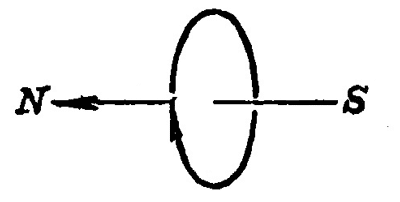 导体中的电流是由电荷的运动形成的,因而我们不难理解通电导线的磁场是由电荷的运动产生的。那么,能不能进一步用实验直接证实:原来静止的电荷,当它运动起来的时候就会产生磁场呢?这个问题早在一百多年以前就提出来了。1876 年美国的罗兰用实验证实了这一点,罗兰把大量的电荷加在一个橡胶圆盘上,然后使盘绕中心轴高速转动,在盘的附近用小磁针来检验运动电荷产生的磁场(图 1–9),结果他发现:当带电盘转动时,小磁针果然发生了偏转,而且改变盘的转动方向或者改变所带电荷的正负时,小磁针的偏转方向电改变,磁针的偏转方向跟运动电荷所形成的电流方向间的关系同样符合安培定则。这个实验证明了运动电荷确实产生磁场,进一步揭示了磁现象的电本质。