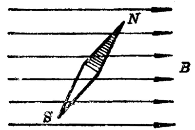 (1)磁体的北极在磁场中所受的磁场力跟磁场方向同向,南极所受的磁场力跟磁场方向反向。图 1–12 是放在磁场中的小磁针,试根据小磁针所受的力说明,它将怎样转动以及静止在哪个方向。
