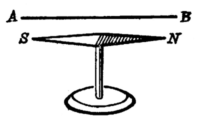 (2)在图 1–13 中,当电流通过导线时,导线下面的磁针北极转向读者。试判断 AB 中电流的方向。