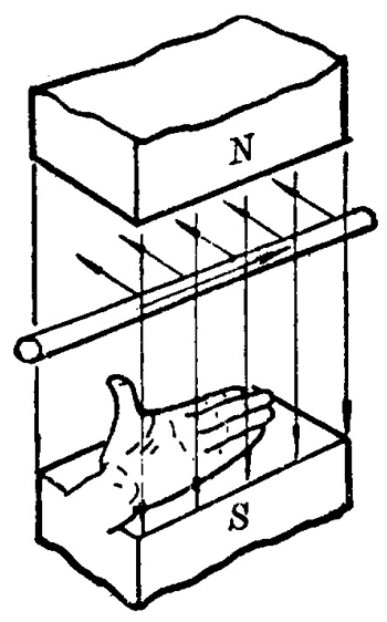 在图 1–2 的实验中,磁场方向跟电流方向也是垂直的,这时可以用左手定则来判定安培力的方向(图 1–22):伸开左手,使大拇指跟其余四个手指垂直,并且都跟手掌在一个平面内,让磁力线垂直进入手心,并使四指指向电流方向,这时手掌所在的平面跟磁力线和导线所在的平面垂直,拇指所指的方向就是通电导线在磁场中的受力方向。