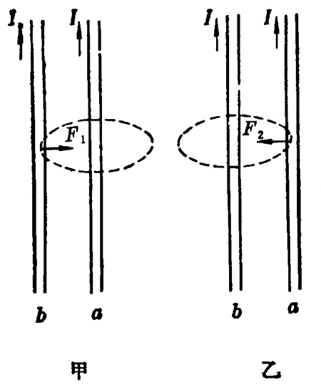 图 1–23 表示两根平行的直导线,其中通以大小和方向都相同的电流 I,导线 b 处于导线 a 的磁场中,因而受到这个磁场的安培力 F1,从左手定则可以知道,F1 在纸面内自左向右,指向导线 a,如图甲所示。设两导线的长度为 l,两导线间的距离为 r,导线 a 在导线 b 处产生的磁感应强度 B = kI/r,导线 b 所受的安培力 F1 = IlB = kI2l/r。同样,导线 a 处于导线 b 的磁场中,受到的安培力 F2 在纸面内自右向左,指向导线 b,如图乙所示。同样可以算出 F2 的大小:F2 = kI2l/r。可见两导线受到大小相等方向相反的引力,这个引力的大小 F 为