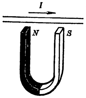 (3)如图 1–25 所示,把一根通电的直导线放在蹄形磁铁的两个磁极上方。导钱可以自由移动和转动,如果电流的方向如图所示,导线将产生怎样的运动?
