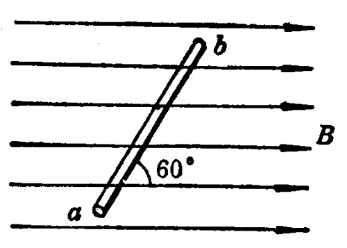 (5)在磁感应强度是 4.0×10−2 特的匀强磁场里,有一条和磁场方向相交成 60° 角、长 8 厘米的通电直导线 ab(图 1–26)。通电导线 ab 所受的安培力是 1.0×10−2 牛,方向和纸面垂直指向读者,求导线里电流的大小和方向。