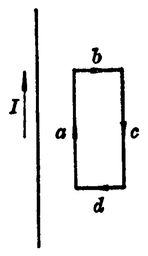 (7)如图 1–27 所示,在通电长导线的旁边放一个可以自由移动和转动的矩形通电线圈,线圈和导线在同一平面上,它的 a,c 两边和导线平行,试讨论一下线圈各边的受力情况,线圈在磁场中将怎样运动?