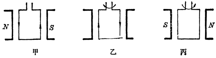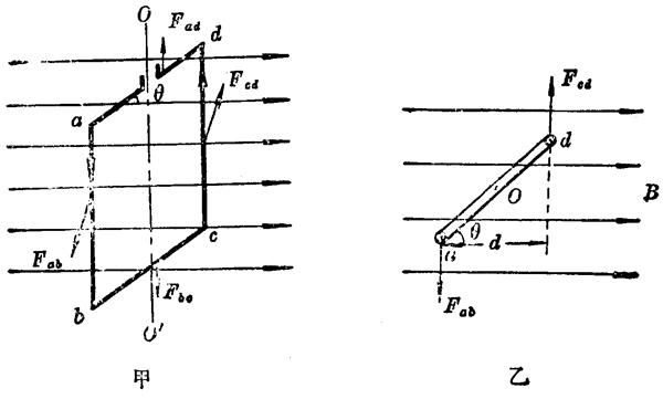 图 1–30 甲表示放在匀强磁场中的通电矩形线圈,线圈平面跟磁力线成 θ 角。线圈顶边 da 和底边 bc 所受的安培力 Fda 和 Fbc 大小相等,方向相反,彼此平衡,ab 和 cd 两个侧边与磁力线垂直,它们受到的安培力 Fab 和 Fcd 虽然大小相等,方向相反,但是它们形成力偶,使线圈绕竖直轴 OO′ 转动。