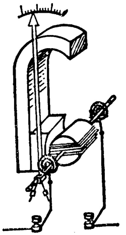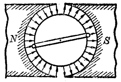 蹄形磁铁和铁心间的磁场是均匀地辐向分布的(图 1–32),不管通电线圈转到什么角度,它的平面都跟磁力线平行,因此磁场使线圈偏转的力偶矩 M1 不随偏角而改变。另一方面,线圈的偏转使弹簧扭紧或扭松,于是弹簧产生一个阻碍线圈偏转的力矩 M2。线圈偏转的角度越大,弹簧的力矩 M2 也越大。到 M1 跟 M2 平衡时,线圈就停在某一偏角上,固定在转轴上的指针也转过同样的偏角,指到刻度盘的某一刻度。