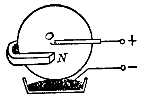 (3)在玻璃皿中放入电解质溶液,在玻璃皿的中心放一个圆柱形电极,边缘放一个围环形电极,分别接在电池的两极上(图 1–44),如果把玻璃里放在磁场中,液体就旋转起来。为什么?液体旋转的方向跟什么有关系?做一下这个实验,看你的判断是否正确?