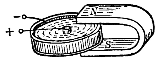 (2)把一个可以绕水平轴转动的铝盘放在蹄形磁铁之间,盘的下边缘浸在导电液体中(图 1–43)。把转轴和导电液体分别接到直流电源的两极上,铝盘就会转动起来。为什么?用什么方法可以改变铝盘的转动方向?