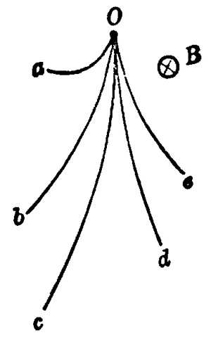 (8)图 1–45 表示由 O 点发出的电子和正电子(质量和电量跟电子相同,但带的是正电荷)在匀强磁场中运动的径迹.哪些径迹是电子的,哪些径迹是正电子的?a,b,c 三条径迹中,哪个粒子的能量最大,哪个最小?