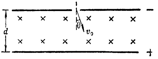 (14)图 1–48 表示两个平行金属板,它们之间的距离为 d,分别接在电源的两极上。在两平行金属板当中的空间存在着彼此垂直的电场和磁场,电场强度为 E,磁感应强度为 B。从负极板的小孔射入一个电子,经过有电场和磁场同时存在的空间,并打在正极板上,射入电子的初速度为 v0,方向跟竖直方向成 θ 角。求电子打在正极板上的速度的大小。