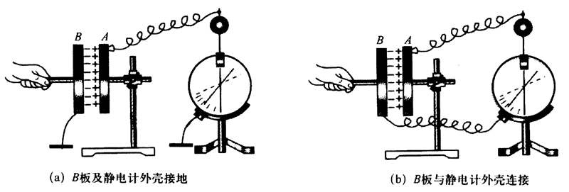 图 2(a)把 B 板与金属外壳都接地,当 A 板带上正电时,B 板的右侧与金属外壳的内侧都会由于感应而带上负电,而 B 板的左侧与金属外壳的外侧都不带电;图 2(b)用导线把 B 板与金属外壳连接起来而不接地,当 A 板带上正电时,B 板的右侧与金属外壳的内侧都会由于感应而带上负电,而 B 板的左侧与金属外壳的外侧则带上等量的正电荷。