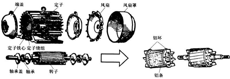 图 4 是三相交流感应电动机的实物图,它分为定子和转子两大部分,定子的核心部分是定子铁芯及绕在铁芯凹槽中的定子绕组,它由三个匝数相同的线圈组成,互成 120° 角排列,可以采用星形连接,也可以采用三角形连接,通以三相交流电,就会在定子铁芯的内部产生旋转磁场。转子的核心部分是转子铁芯,铁芯凹槽中可以嵌入线圈,但更多的是用铝浇注,在两端用铝环连接成闭合的导体,并安有扇叶。图 4 的右下角就是把转子拆解开来,其右边展现的是转子连同转轴的形状,左边则是去掉铁芯后的闭合导体,它包括两端的铝环及中间的铝条,形状像一个鼠笼,因此也称为鼠笼式电动机。