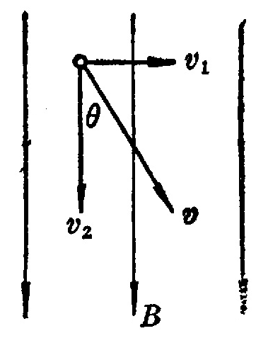 如果导线的运动方向跟导线本身垂直,但跟磁力线方向有一个夹角 θ(图2–21),我们可以把速度 v 分解为两个分量:垂直于磁力线的分量 v1 = vsinθ,平行于磁力线的分量 v2 = vcosθ。后者不切割磁力线,不产生感生电动势。前者切割磁力线,产生的感生电动势为 E = Blv1 而 v1 = vsinθ,所以