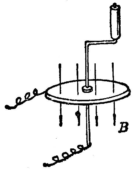 (7)图 2–23 是法拉第做成的世界上第一个发电机模型的原理图。把一个铜盘放在磁场里,使磁力线垂直穿过铜盘;转动铜盘,就可以获得持续的电流。试解释其作用原理。