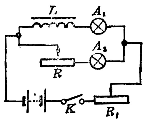 在图 2–25 所示的实验中,先合上开关 K,调节变阻器 R 的电阻,使同样规格的两个灯泡 A1 和 A2 的明亮程度相同,再调节变阻器 R1 使两个灯泡都正常发光,然后断开开关 K。