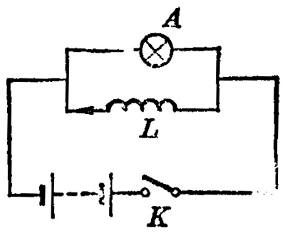 现在再来做图 2–26 的实验,把灯泡 A 和带铁芯的电阻较小的线圈 L 并联接在直流电路里,接通电路,灯 A 正常发光后,再断开电路,这时可以看到,灯 A 要过一会儿才熄灭,为什么会出现这种现象呢?这是由于电路断开的瞬间,通过线圈的电流突然减弱,穿过线圈的磁通量也就很快地减少,因而在线圈中产生感生电动势。虽然这时电源已经断开,但线圈 L 和灯泡 A 组成了闭合电路,在这个电路中有感生电流 I 通过,所以灯泡不会立即熄灭。
