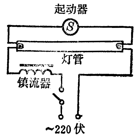 当开关闭合后,电源把电压加在起动器的两极之间,使氖气放电而发出辉光,辉光产生的热量使 U 形触片膨胀伸长,跟静触片接触而把电路接通。于是镇流器的线圈和灯管的灯丝中就有电流通过,电路接通后,起动器中的氖气停止放电,U 形触片冷却收缩,两个触片分离,电路自动断开。在电路突然中断的瞬间,在镇流器两端产生一个瞬时高电压,这个电压加上电源电压加在灯管两端,使灯管中的水银蒸气开始放电,于是日光灯管成为电流的通路开始发光,在日光灯正常发光时,由于交流电不断通过镇流器的线圈,线圈中就有自感电动势,它总是阻碍电流变化的,这时镇流器起着降压限流作用,保证日光灯的正常工作。