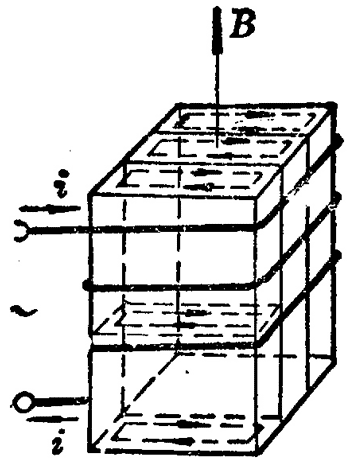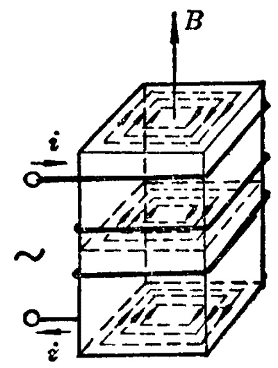 为了减少涡流损失,电机和变压器通常用涂有绝缘漆的薄硅钢片叠压制成的铁芯,如图 2–31 所示。这样涡流被限制在狭窄的薄片之内,回路的电阻很大,涡流大为减弱,从而使涡流损失大大降低。铁芯采用硅钢片,是因为这种钢比普通钢的电阻率大,可以进一步减少涡流损失。硅钢的涡流损失只有普通钢的 1/5 ~ 1/4。