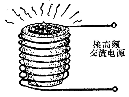 图 2–32 是冶炼金属的高频感应炉的示意图,这种电炉就是利用涡流来熔化金属的,冶炼锅内装入被冶炼的金属,让高频交流电通过线圈,被冶炼的金属中就产生很强的涡流,从而产生大量的热使金属熔化。这种冶炼方法速度快,温度容易控制,并能避免有害杂质混入被冶炼的金属中,因此适于冶炼特种合金和特种钢。