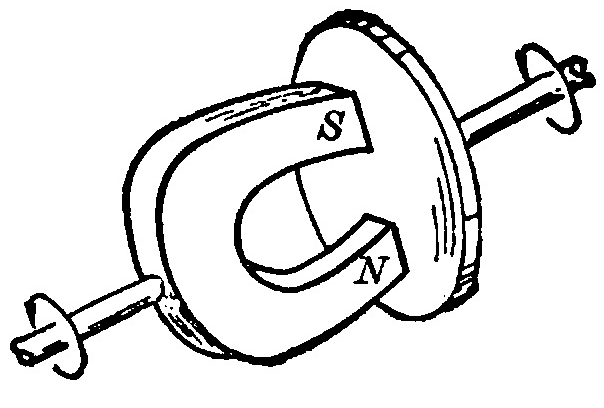 (2)如图 2–34 所示,把蹄形磁铁的两极靠近一个金属圆盘,但不接触。当磁铁绕轴转动时,圆盘也绕轴转动起来,解释这个现象。