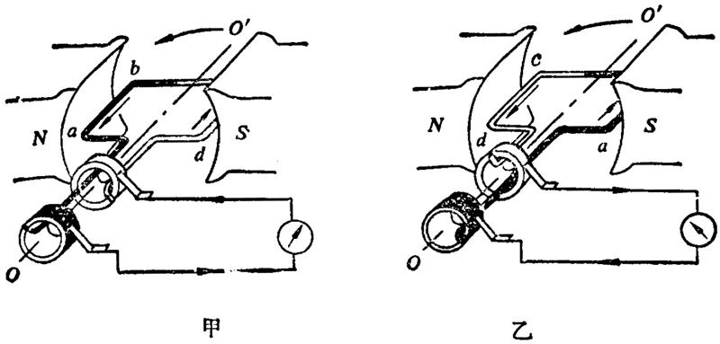 线圈在磁场中转动时,它的 ab 边和 cd 边切割磁力线,在线圈中产生感生电动势,在电路中就产生感生电流。当线圈平面转到图 3–1 甲所示的位置时,ab 边向下运动,cd 边向上运动,感生电动势和感生电流的方向如图中所示。线圈转过半周,当线圈平面转到图 3–1 乙所示的位置时,ab 边变成向上运动,cd 边变成向下运动,感生电动势和感生电流的方向都发生了改变。当线圈平面转到跟磁力线垂直的平面时,在这一时刻,ab 边和 cd 边的线速度方向跟磁力线平行,都不切割磁力线,因而没有感生电动势和感生电流。跟磁力线垂直的这个平面叫做中性面,线圈平面每经过中性面一次,感生电动势和感生电流的方向就改变一次,因此,线圈转动一周,感生电动势和感生电流的方向改变两次。