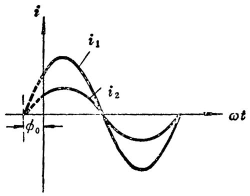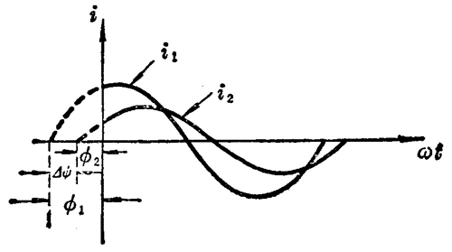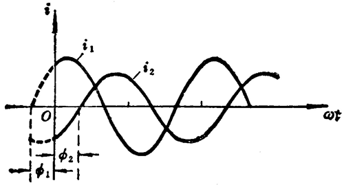 图 3–8 表示两个频率相同的交流电,但初相不同,且 ϕ1 > ϕ2。从图中可以看出,这两个交流电的变化步调不一致,i1 比 i2 先到达正的最大值,零或负的最大值。这时我们说 i1 比 i2 超前 ∆ϕ 角,或者 i2 比 i1 落后 ∆ϕ 角。