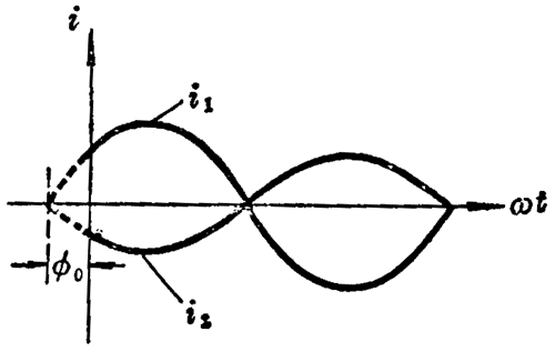 两个频率相同的交流电,如果相差为 180°,即 ∆ϕ = π,这两个交流电叫做反相的。这两个交流电的变化步调恰好相反(图 3–7):一个到达正的最大值,另一个恰好到达负的最大值;一个减小到零,另一个恰好增大到零。