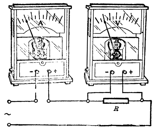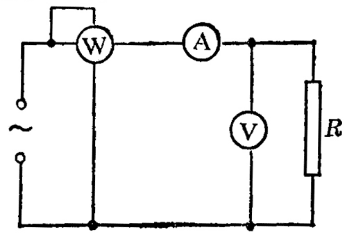 我们看到,在纯电阻电路中,功率的表达式跟直流电路中的形式完全相同,所不同的是在交流电路中电流和电压要用有效值,上述表达式也可以用实验证实。在图 3–13 所示的电路中,标有 W 的仪表叫瓦特表,是用来测量功率的,接通电路后,把瓦特表的读数跟安培表和伏特表的读数加以比较,就可以知道 P = UI。
