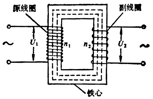 图 3–25 是变压器的示意图。变压器是由闭合铁芯和绕在铁芯上的两个线圈组成的。一个线圈跟电源连接,叫原线圈(也叫初级线圈);另一个线圈跟负载连接,叫副线圈(也叫次级线圈),两个线圈都是用绝缘导线绕制成的,铁芯由涂有绝缘漆的硅钢片叠合而成。