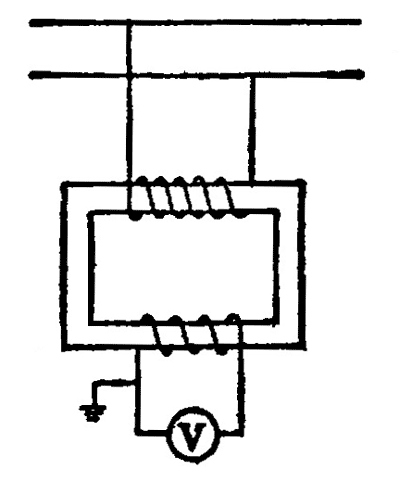 电压互感器(图 3–28)用来把高电压变成低电压,它的原线并联在高压电路中,副线圈上接入交流伏特表,根据伏特表测得的电压 U2 和铭牌上注明的变压比(U1/U2),可以算出高压电路中的电压。为了工作安全,电压互感器的铁壳和副线圈应该接地。