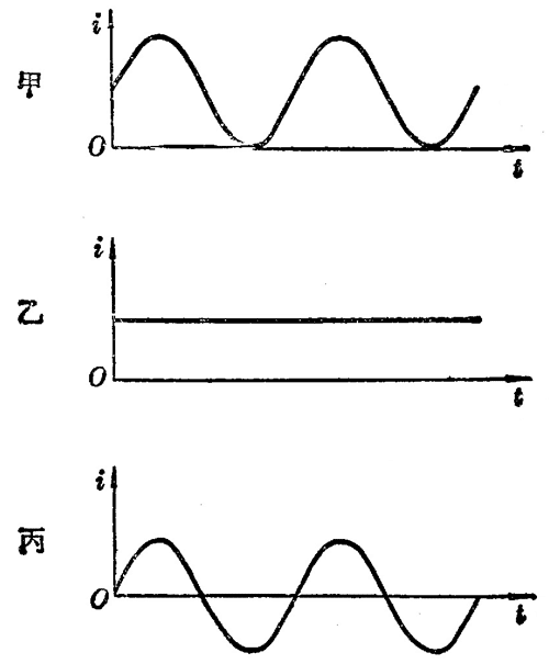 交流电经整流后变成脉动直流电,脉动直流电可以看作是由强度和方向都不随时间变化的直流成分与强度和方向都随时间变化的交流成分组成的。例如,图 3–36 甲所示的脉动直流电就可以看作是由直流成分(图乙)和交流成分(图丙)叠加形成的。其他的脉动直流电,也可以看作是由强度不变的直流成分和一个或几个交流成分叠加形成的。脉动直流电含有交流成分,往往不能适应实际需要,例如用来作收音机的电源,收音机就会发出嗡嗡的交流声,为了使脉动直流电变得比较平稳,需要把其中的交流成分滤掉,这叫做滤波。常用的滤波电路有电容滤波、电感滤波和 π 型滤波。