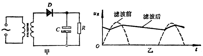 电容器具有通交流隔直流的作用,可以作滤波元件。图 3–37 甲是带有电容滤波的半波整流电路,电解电容器 C 和负载电阻 R 并联。并联电路有分流作用,当电容器的电容比较大时,容抗比较小,脉动电流的交流成分大部分通过电容器而滤掉,直流成分和一小部分交流成分通过负载电阻。因此,负载电阻的电压和电流就平稳多了。电容器的电容越大,负载电阻的电压和电流就越平稳,图 3–37 乙的粗实线是经过电容滤波的电压波形。这个电压波形可以用示波器观察到。