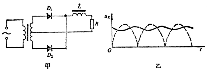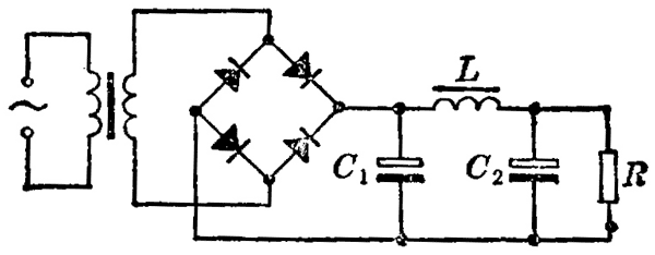 电感线圈具有通直流阻交流的作用,也可作滤波元件。图 3–38 甲是带有电感滤波的全波整流电路,低频扼流圈 L 和负载电阻 R 串联。串联电路有分压作用,低频扼流圈的电感比较大,感抗也比较大,电压的交流成分大部分降在低频扼流圈上,低频扼流圈的电阻一般比负载电阻小,电压的直流成分大部分降在负载电阻上,因此,负载电阻的电压和电流也平稳多了。电感线圈的电感越大,负载电阻的电压和电流就越平稳,图 3–38 乙的粗实线是经过电感滤波的电压波形。把电容滤波和电感滤波组合起来,可以组成滤波效果更好的 π 型滤波,图 3–39 是带有 π 型滤波的桥式整流电路。如果负载需要的电流不大,电感线圈也可以用电阻来代替,这样做虽然滤波效果差一些,但成本低、体积小,所以常常采用。