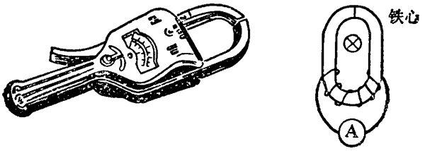 (5)图 3–59 是电工常用的钳形电流表,可以用来测定交变电流,把钳口打开,把被测的通电导线放在钳口中间(右图),交流电表就可以测出导线中的电流强度。试说明钳形电流表的工作原理。