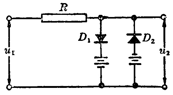 (7)图 3–60 是电子技术中用到的限幅电路,电池组的电动势都为 E,左端输入的是正弦交流电,电压 u1 的最大值为 2E。试画出右端输出的电压 u2 的图象,并分析说明理由。电池组的内电阻略去不计。
