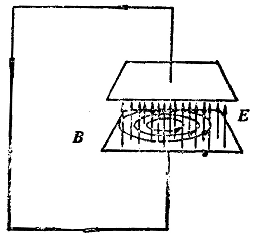 既然变化的磁场能够产生电场,相反地,变化的电场是否也能够产生磁场呢?麦克斯韦用场的观点分析了电磁现象,认为变化的电场能够在周围的空间产生磁场。这是电磁场理论的第二个要点。一个静止的电荷,它产生的是静电场,即空间各点的电场强度不随时间而变化,这个电荷一且运动起来,电场就发生变化,即空间各点的电场强度将随着时间而变化。另一方面,运动电荷要产生磁场。用场的观点来分析这个问题。就可以说:这个磁场是由变化的电场产生的,在电容器充放电时,两极板间的电场发生变化,这个变化的电场产生磁场(图 4–5),而且这个磁场跟假定两极板间存在电流时所产生的磁场是一样的。