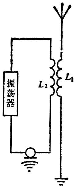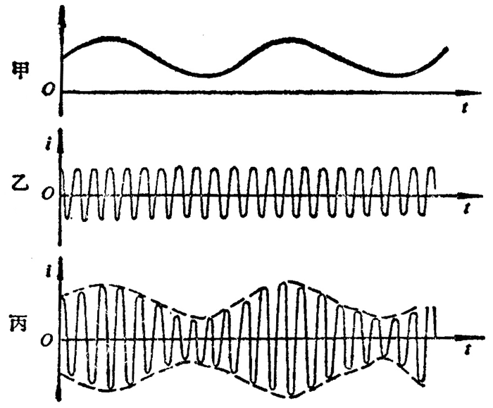 图 4–13 是调幅装置的示意图,接在振荡器和线圈 L2 之间的话筒就是一个最简单的调制器。由声源发出的声音振动使话筒里的碳粒发生时松时紧的变化,它的电阻也发生时大时小的变化,所以,虽然振荡器产生的是高频等幅振荡电流(图 4–14 乙),但在线圈 L2 中通过的却是振幅随声音而改变的高频调幅电流(图 4–14 丙)。由于 L2 和 L1 的互感作用,通过开放电路中的也是这种高频调幅电流,于是从开放电路就发射出振幅随声音面改变的电磁波。这种电磁波叫做调幅波。