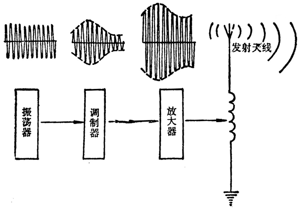根据这节和前节所讲的,我们看到,在电磁波的发送中必须有振荡器、调制器、天线和地线。振荡器产生高频等幅振荡电流,经过调制器后,成为被调制的高频振荡电流,于是开放电路就发射出带有调制信号的电磁波。为了使电磁波能传得很远,还需要用放大器把被调制的高频振荡电流加以放大,以增强开放电路发射电磁波的功率,整个发送装置的方框图如图 4–15 所示。