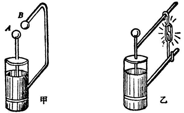 用莱顿瓶[1]和带有间隙 AB 的矩形线圈组成第一个电路(图 4–16 甲),用同样的莱顿瓶和带有氖管的一边可移动的矩形线圈组成第二个电路(图 4–16 乙)。莱顿瓶具有电容,矩形线圈具有电感,所以这两个电路都是振荡电路。