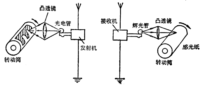 在发射端,把图片贴在图 4–21 左方的转动筒上,转动筒在光电管近旁,一边转动,一边沿轴向移动。这样,图片各部分反射出的强弱不同的光,按照一定顺序照射到光电管上,在光电管电路中就出现了强弱变化的信号电流。用光电管电路作调制器,把信号电流调制到高频等幅振荡电流上,经过发射机就发射出带有传真信号的无线电波。