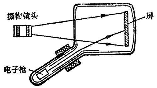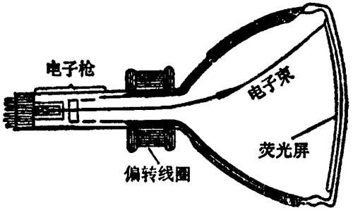在电视接收端,把电信号转换成景物的像,是由显像管(图 4–24)来完成的。电视机接收到带有图像信号的无线电波后,经过放大、检波,把图像信号送到显像管,显像管里也有一个电子枪,它发射电子束的强弱受图像信号的控制,并且按照跟摄像管的电子枪同样的步调和方式扫描,这样,当电子束射到显像管底部的荧光屏上时,在屏上就出现跟摄像管屏上相同的图像。