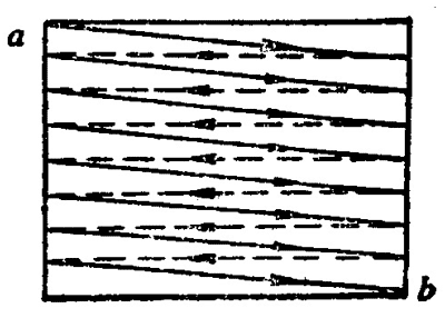 在电视的发射端,摄取景物并将景物反射的光转换为电信号,是由摄像管(图 4–22)来完成的,摄像时,摄像镜头将被摄物体的像成在摄像管中的屏上。电子枪发出的电子束按一定规律偏转,对屏上的图像进行扫描,扫描的路线如图 4–23 所示,从 a 开始,逐行进行,直到 b。这样,把一幅图像各个部分的明暗情况逐点变成强弱不同的信号电流,经过发射机就发射出带有图像信号的无线电波。