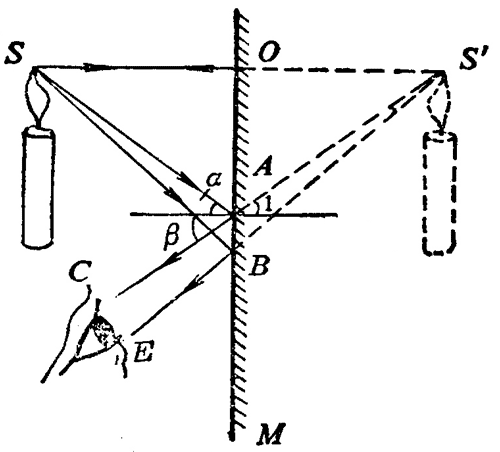 从 S 点发出的垂直于镜面的光线 SO,经镜面反射后,沿原路返回。这条反射光线的反向延长线也通过 Sʹ 点。根据反射定律,可以证明直角三角形 SAO 和 SʹAO 全等,所以 SʹO = SO。就是说,像到镜面的距离等于物到镜面的距离。像和物对镜面是对称的。